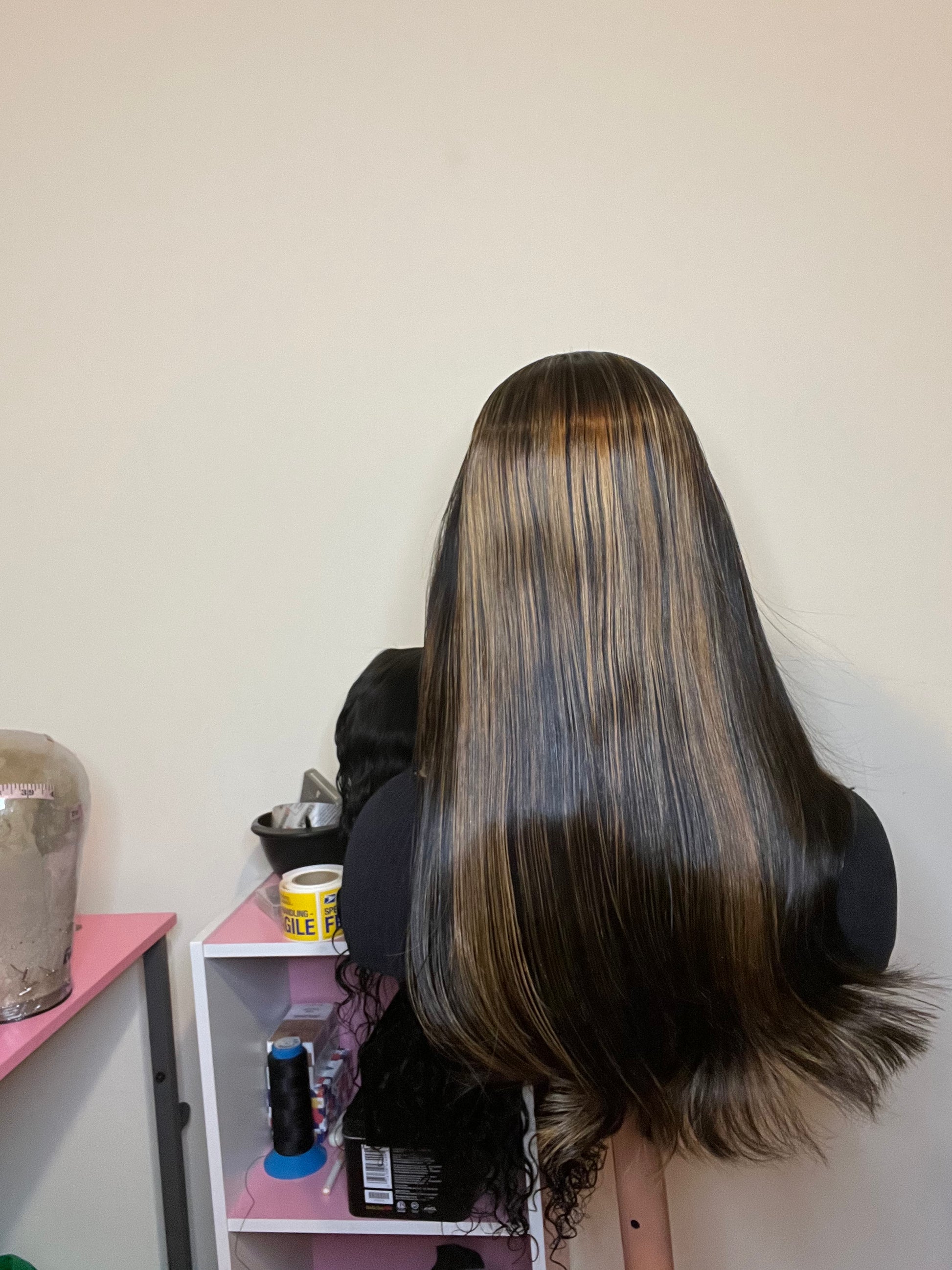 Chunky highlights, layers in the front, and baby hair. Adjustable band and comb in the back.