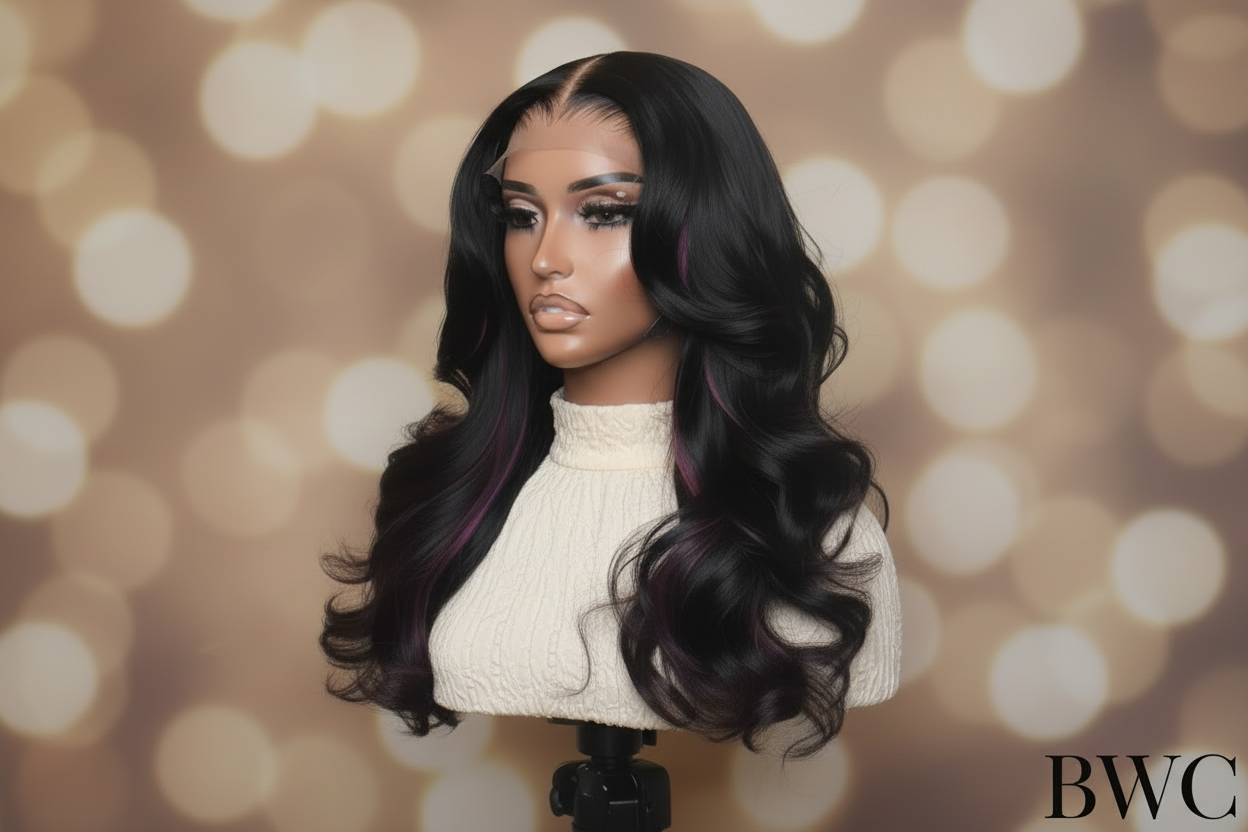 This 18” body wave features a rich jet-black base enhanced with bold violet highlights for a subtle yet striking pop of color. Designed to move beautifully and catch the light with every turn.