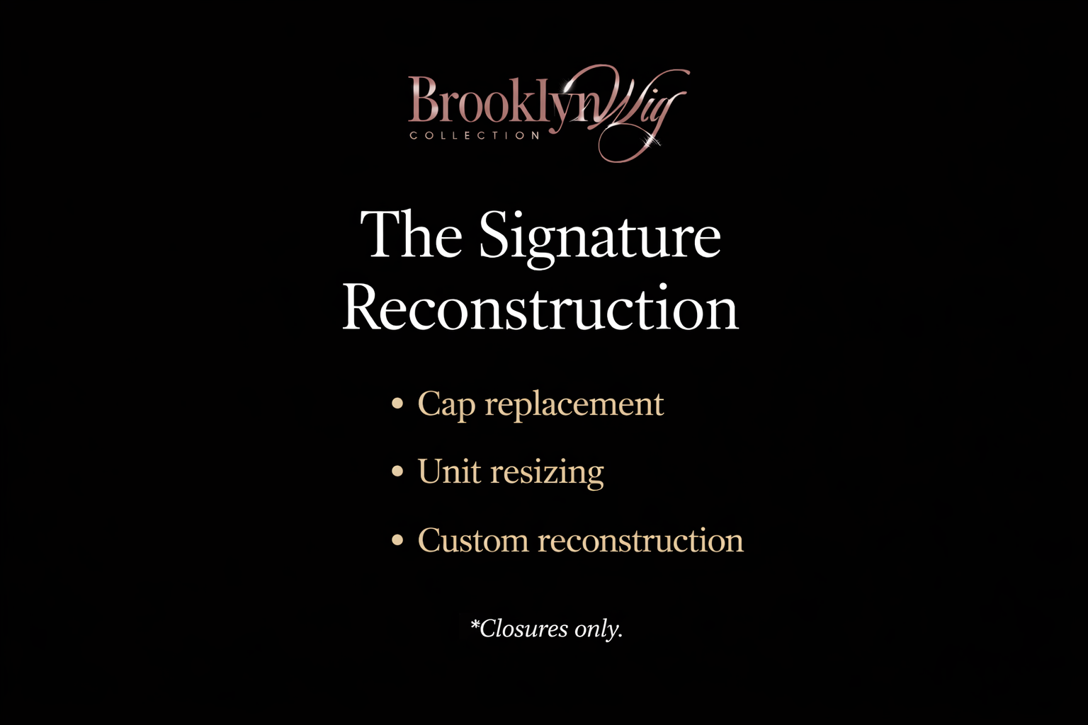 The Signature Reconstruction service is for units that need structural changes. Whether your wig needs to be reconstructed onto a new cap, resized for a better fit, or created from bundles and a closure — this service restores the foundation.